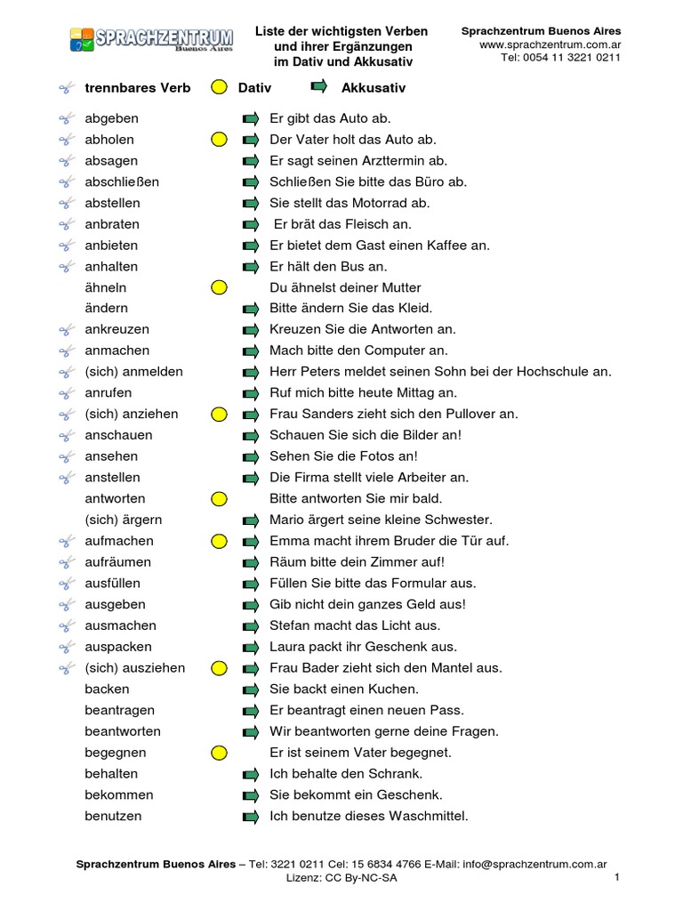 Liste Der Wichtigsten Verben Und Ihrer Erganzungen Im Dativ Und Akk
